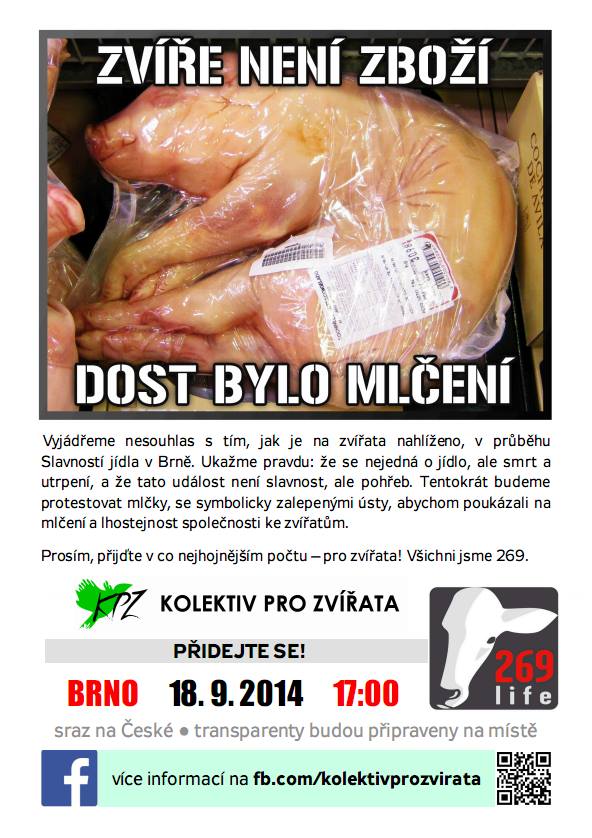 Vyjádřeme nesouhlas s tím, jak je na zvířata nahlíženo, při příznačné události - Slavnostech jídla v Brně. Ukažme pravdu: že se nejedná o jídlo, ale smrt a utrpení a že tato událost není slavnost, ale pohřeb. Tentokrát budeme protestovat mlčky, se symbolicky zalepenými ústy, abychom poukázali na mlčení a lhostejnost společnosti ke zvířatům.