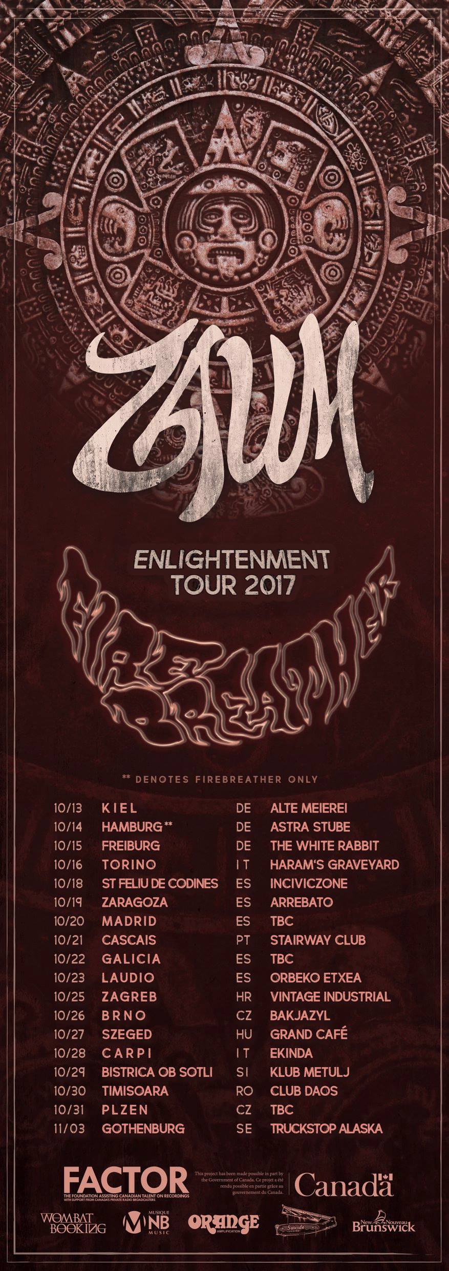 ZAUM - mantra doom - Moncton, Kanada http://www.zaum.ca/ https://zaum.bandcamp.com/ https://www.facebook.com/zaumn/ Dvacetiminutové vály, při jejichž poslechu vám budou vstávat chlupy po celém těle. Doom, psychedelie, zaříkávání, zvuk tak hutný, že vás přibije k zemi.