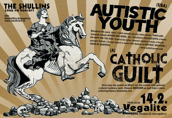 Kapela AUTISTIC YOUTH hraje melodický HC/punk, který v sobě nezapře své rodné město Portland (temná nálada kapel WIPERS, RED DONS), živočišnost Kalifornie (ADOLESCENTS) a dánský okázalý šmrnc (NO HOPE FOR THE KIDS). Zvonivá hra kytar, sborové chytlavé vokály a hlavně energie. Autistic Youth se za deset let trvání vrací již potřetí do Evropy, stylově s třetí novou fantastickou deskou "Nonage", která vyšla ve spolupráci Dirtnap / Sabotage / Taken By Surprise records. S novou nahrávkou vsadili ještě více na melodičnost a sborovou rozdováděnost, která se zaryje hluboko pod kůži. Hrdý člen portlandského trojlístku Red Dons – The Estranged - Autistic Youth zavítá do Brna na jediné vystoupení široko daleko!