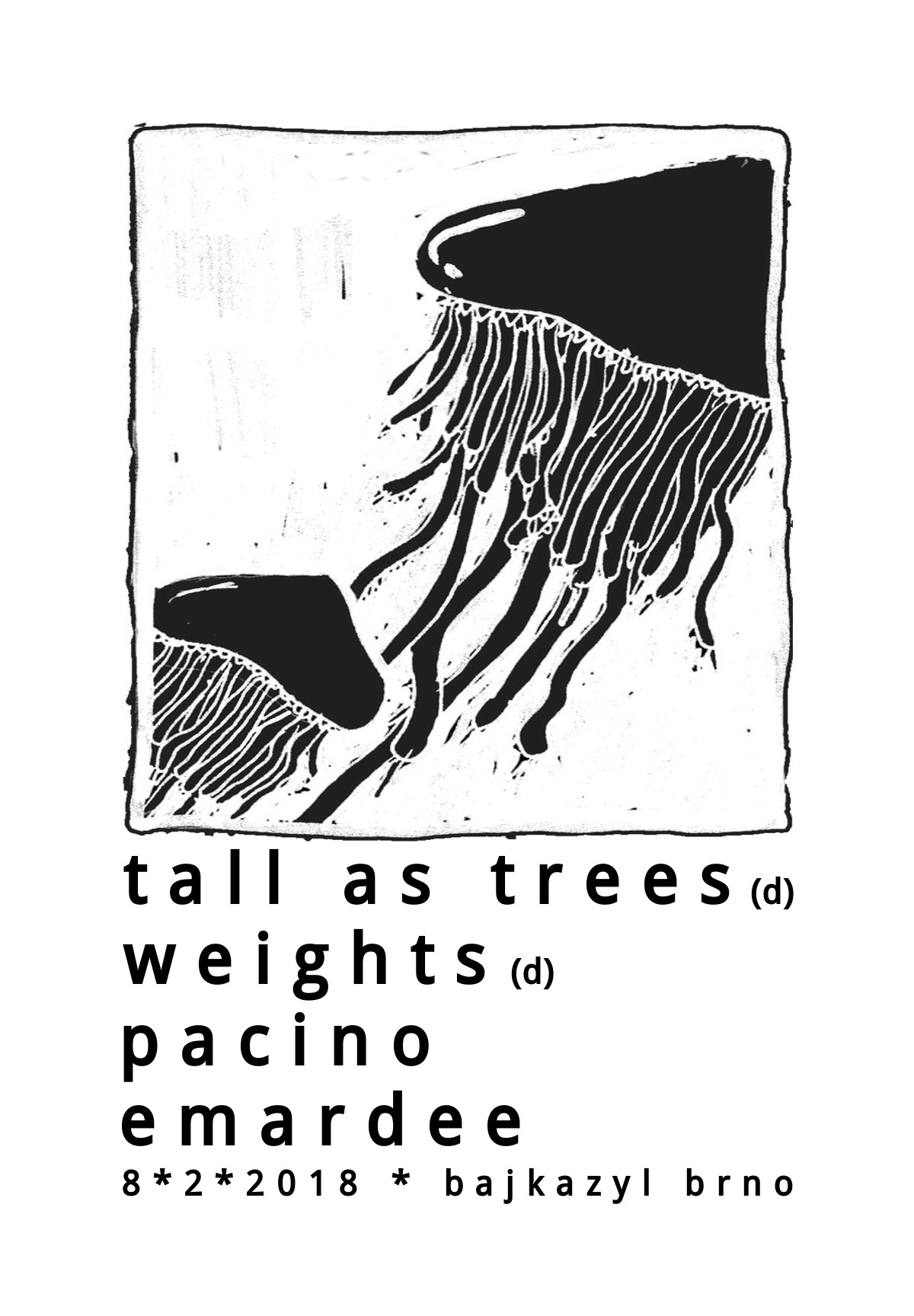 tall as trees tallastrees.bandcamp.com/album/self-titled Naléhavé emíčko z Berlína. Žádný zbytečně velkolepě budovaný kytarový stěny, ale emoce vyřvaný rovnou ze srdce. Kdo si pamatuje předloňský koncert s Remkem a Gattacou, moc dobře ví. Kdo minule nebyl, měl by si absenci nahradit. Weights weightsberlin.bandcamp.com Weights jedou tour s tall as trees. Melodičtější odstín emo-hardcoru německý tradice s punkovým rytmem. Nekomplikovaný přímočarý písně, co míří rovnou k věci. Pacino https://stoned-to-death.bandcamp.com/album/p-l-litru-zem Nejlepší kytarovka. Takový to, když si myslíš, že posloucháš noiserockovou kapelu, ale za dva dny se přistihneš, že si pořád broukáš ty kytarový melodie. Aktuální dvanáctipalec Půl litru země je podle rádia Wave nejlepší česká deska uplynulýho roku. Emardee emardee.bandcamp.com Brněnská instrumentální melancholie, kde můžeš slyšet ozvěny léta, vzpomínky na devádesátý léta nebo třeba Sport. V Bajkazylu staří známí, asi netřeba blíž představovat.