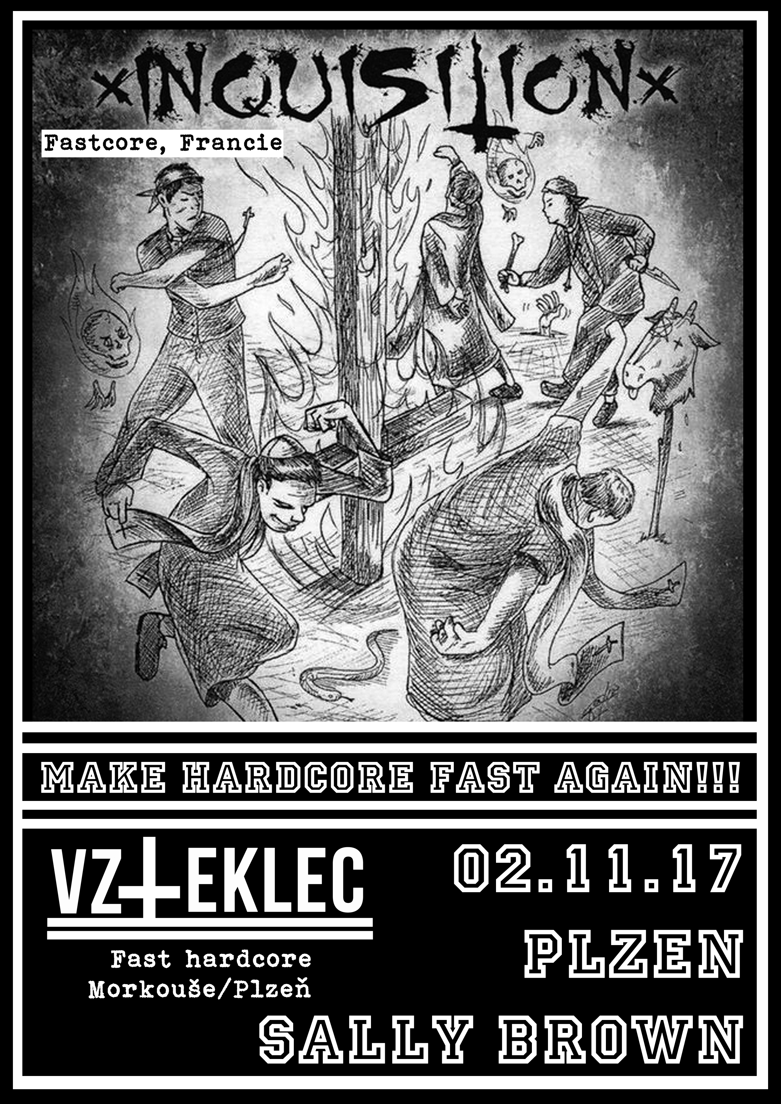 xINQUISITIONx (FRA) https://xinquisitionx.bandcamp.com xINQUISITIONx jsou z Francouzského města Marseille, fungují někdy od roku 2011, za sebou mají několik nahrávek včetně splitů s MALJUTKA, SLAUGHTER IN THE VATICAN, THIS IS WHAT I LEARNED ABOUT LIFE SO FAR, účast na kompilacích “Fast Songs For A Violent World“ a “Wear Your Bandana!“. Několikrát už projeli Evropou a v listopadu to nebude jiný! xINQUISITIONx produkují nakopnutý fastcore s thrashovou kytarou, místy načichlý power-violence. Sebou by měli dovézt i nové album “Blast it“, které vyjde v nejbližších dnech. Make hardcore fast again!